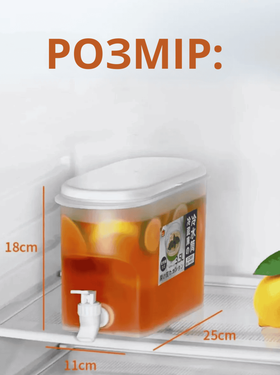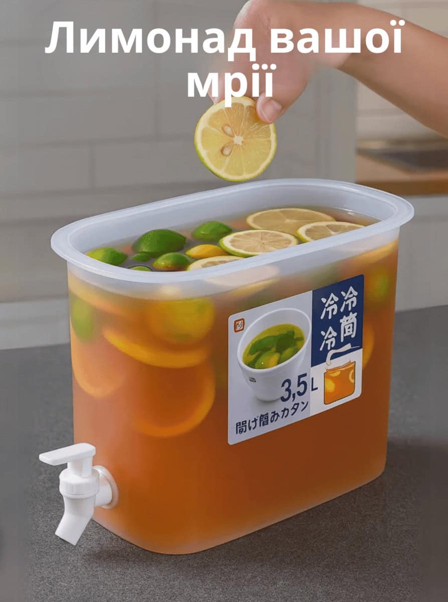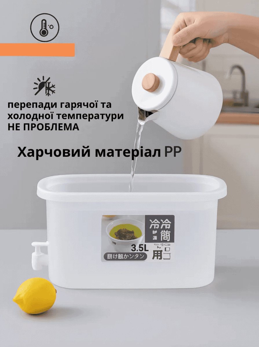 Найкраща покупка! Герметичний контейнер для напоїв з краником об’ємом 3,5 л. Ідеально підходить для соків, компотів, молока, коктейлів та іншої рідини. Виготовлений з безпечних харчових матеріалів PP класу. не боїться падінь, перепадів температури, міцний та довговічний. Витримує від -20°С до 120°С.