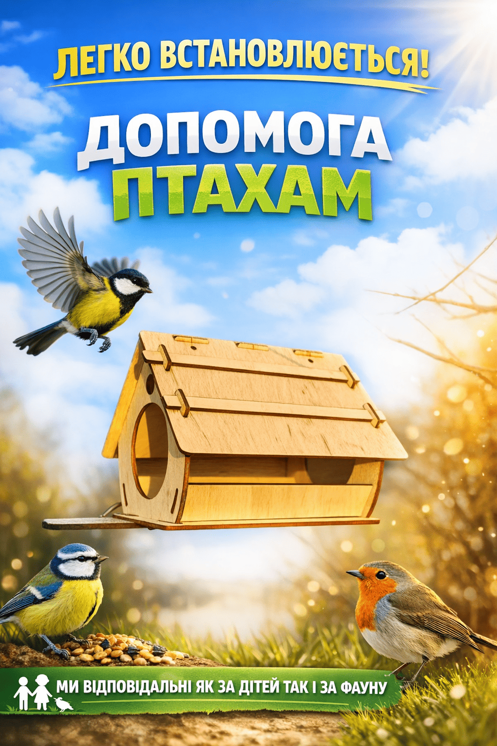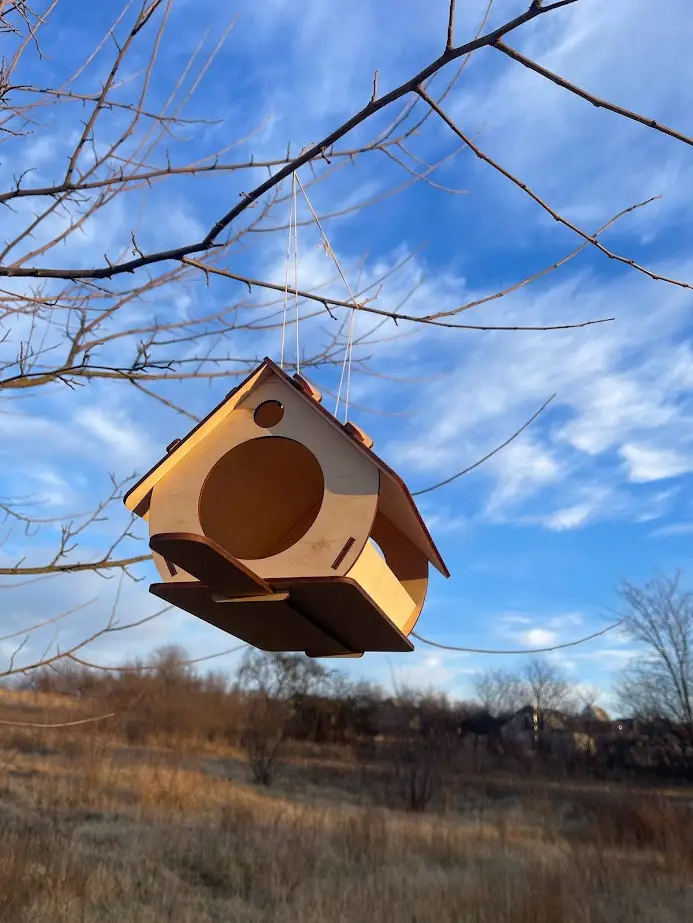 Особлива перевага даної годівниці з фанери полягає у її конструкції та розмірах, спроектованих для забезпечення безпеки птахів від потенційних хижаків та інших загроз. Матеріал виготовлення, фанера, є екологічно чистим, що робить цю годівницю безпечною для птахів та навколишнього середовища.